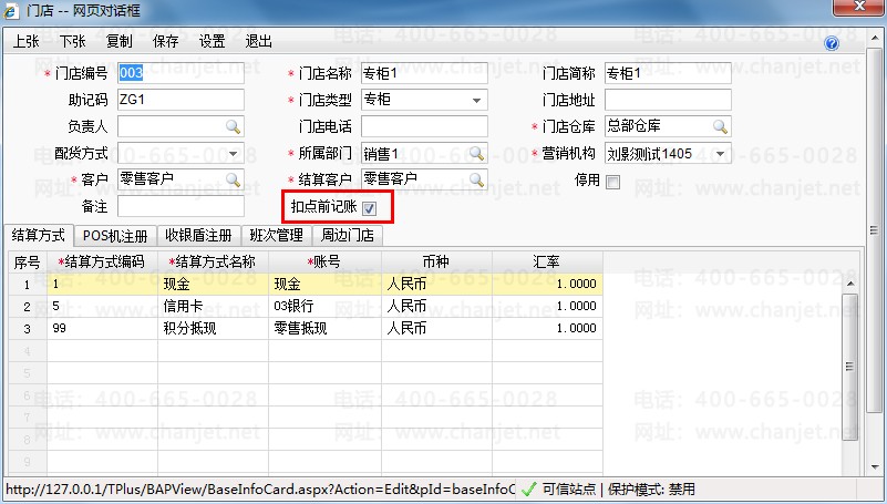 (1)“基础设置”-“常用信息设置”-“门店”中,增加专柜,并且勾上“扣点前记账”: