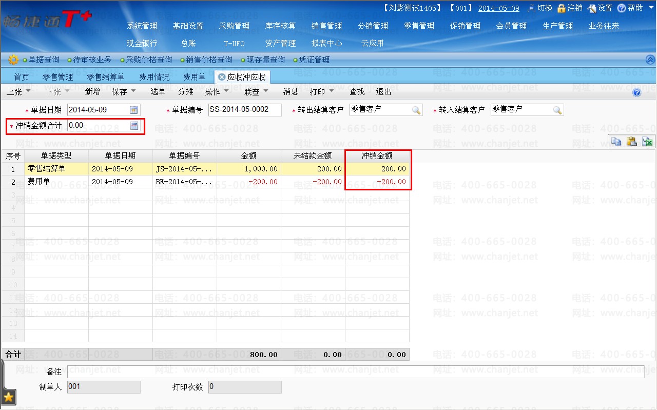 (5)同时需要手工做应收冲应收操作:将零售结算单剩余的200元和费用单中的-200进行核销: