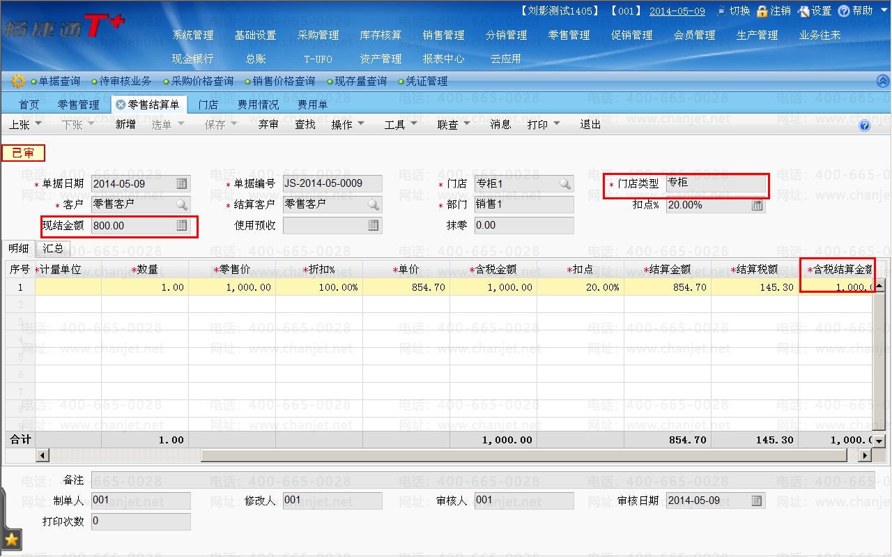 a.零售结算单:1000元为营业收入