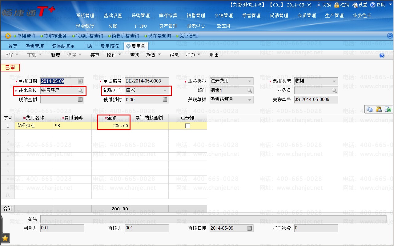 (4)保存审核该单据后点击“联查-”-“费用情况”:软件自动生成一张费用单,金额为扣点的200元: