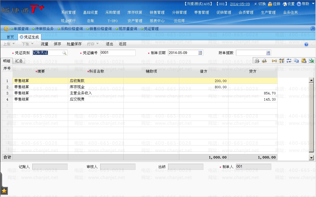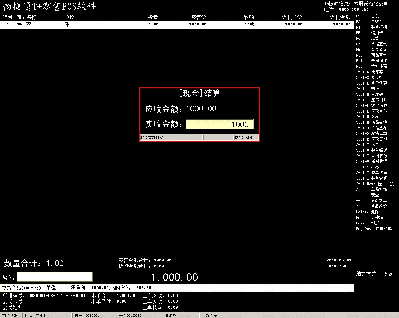 (2)进入pos端正常收银:营业收入为1000元