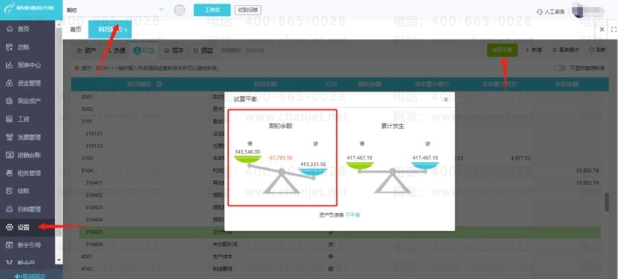 在“科目期初”设置中,检查试算平衡。如果出现不平衡,系统会提示差额。