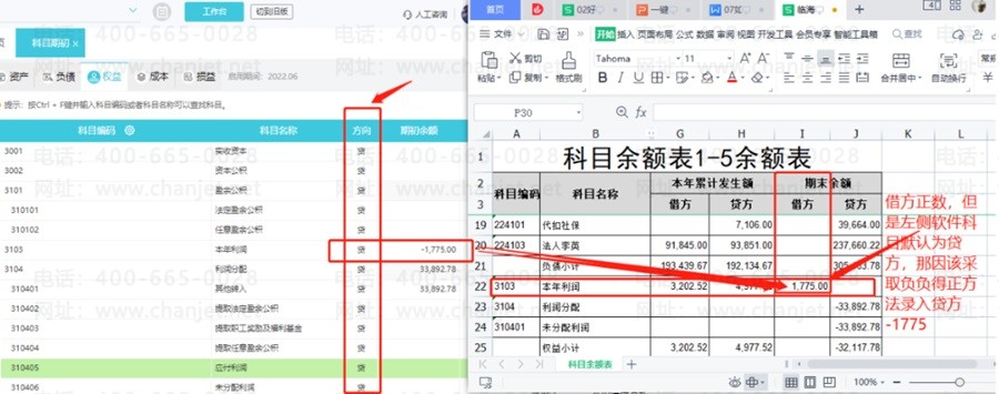 在录入期初余额时,由于不像本年累计那样借贷分开列示,需特别注意科目方向。例如,如果原始余额表中权益类科目(本年利润)在借方有期初数据1775,但软件默认该科目为贷方,就应输入-1775以调整方向。