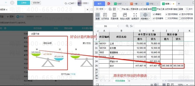 以下图为例,可以看到借方合计金额跟原余额表是一致的,说明问题不出在借方,原软件贷方合计是345546,软件是413331.56,相差67785.56,只需要拿着原余额表去核对下期初所有科目的贷方发生额就能发现问题。(一般是权益类和损益类科目,这些科目较易出错。)