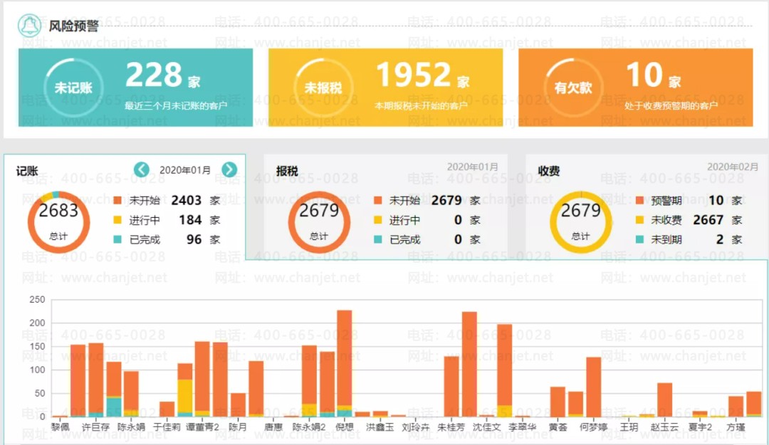 自动监测财务进度,实时预警财税风险,帮助管理层及时掌握进展和员工工作情况,进而确保代账服务质量;