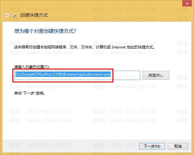 2、弹出创建快捷方式向导,在“请键入项目的位置”中选择T+浏览器,点“浏览”(在T+12.1的安装路径下" D:\Chanjet\TPlusPro12100\Browser\ tplusbrowser"),选择T+浏览器的进程,如下图所示: