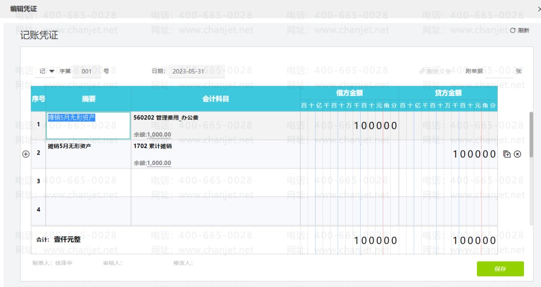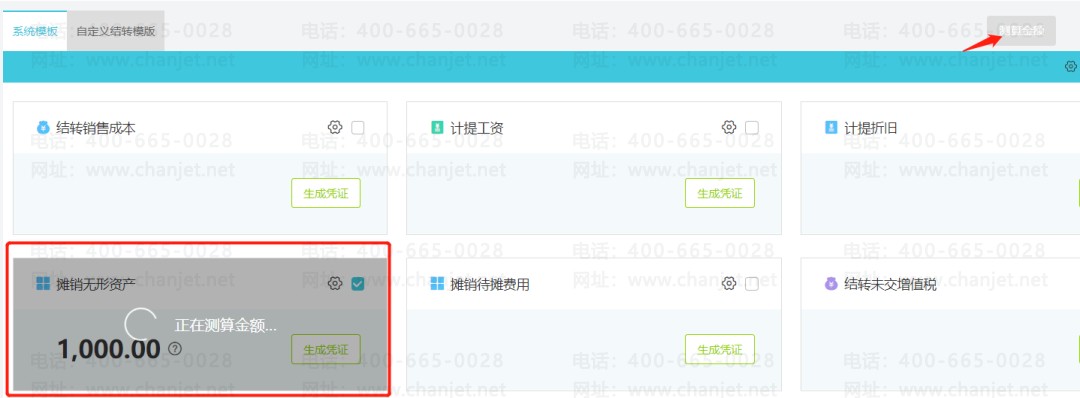 选择月份,点击右上角【测算金额】,易代账会自动进行计算,并在【摊销金额】模板下生成凭证,可以点击【生成凭证】查看凭证详情,有需要可以进行修改和编辑。