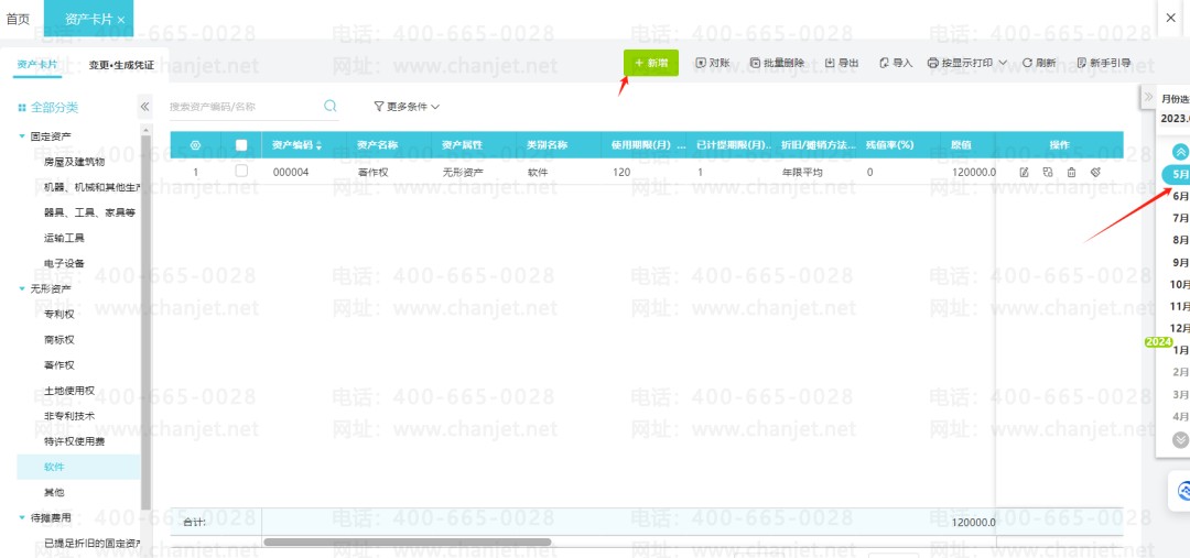 在【全部分类】-【无形资产】下找到【软件】,新增对应无形资产信息,成功新增后查看即可本月摊销情况。