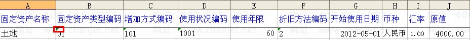 1. 固资模板中第一个页签“sheet1”中固定资产类型编码、增加方式编码、使用状况编码、折旧方法编码等都需要和软件中的基础档案一致且必须是文本格式,具体体现在单元格左上角的绿色小三角