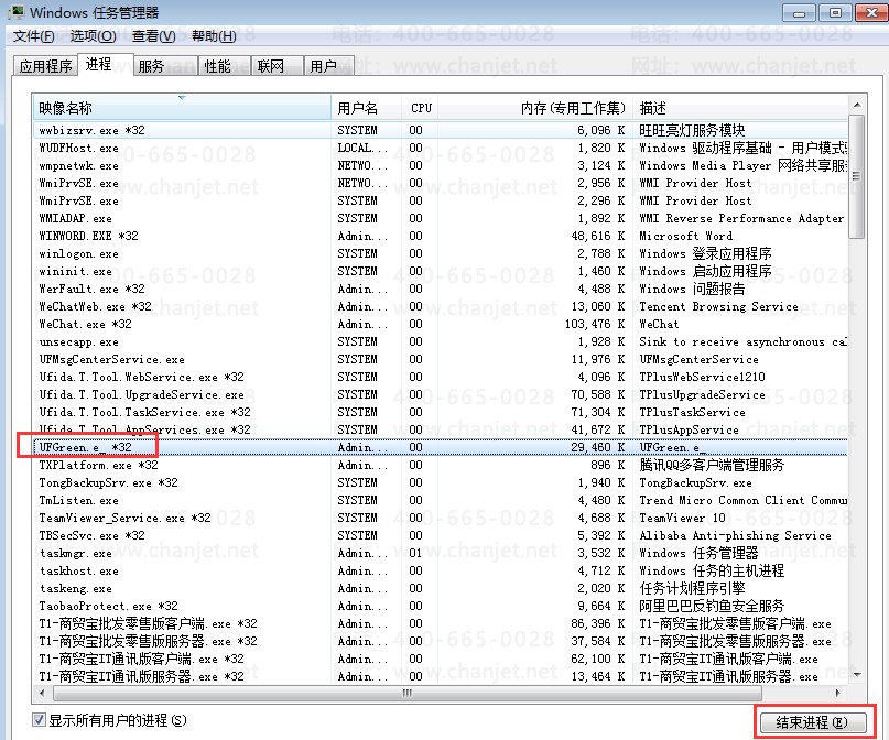 2、同时按住键盘上的ctrl+alt+delete键,打开任务管理器,找到ufGreen的进程,点结束进程。