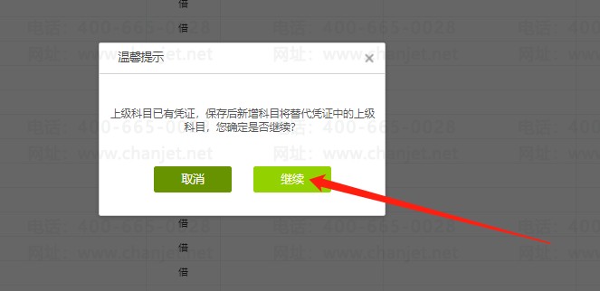 软件提示:上级科目已有凭证和期初数据,保存后新增科目将替代凭证和期初数据中的上级科目,您确定是否继续?