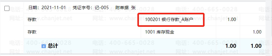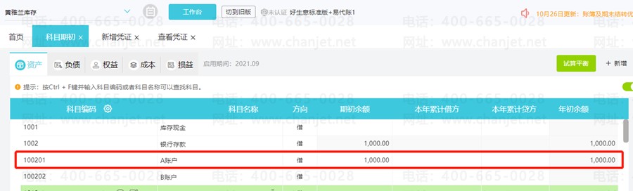3.银行存款科目的余额数据全部转移到新增的第一个100201 银行存款_A账户明细科目上了。
