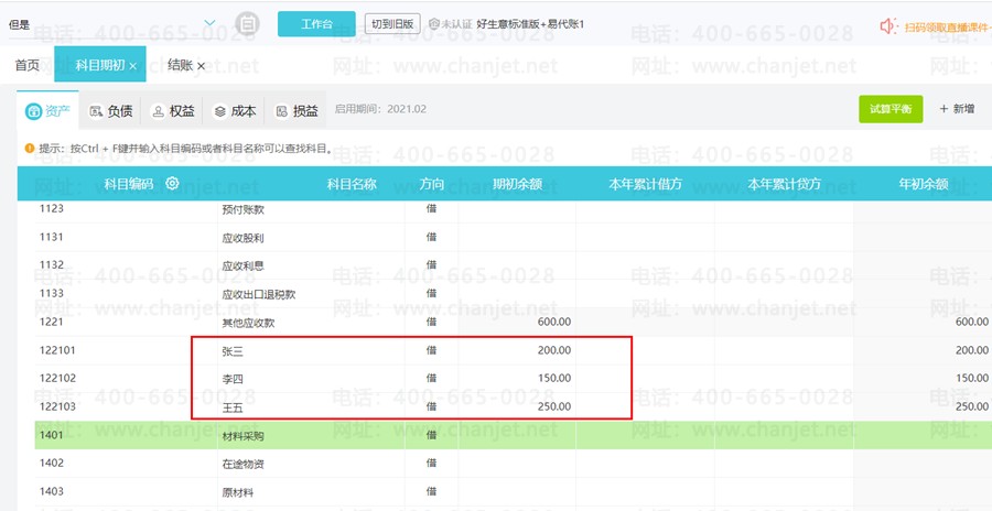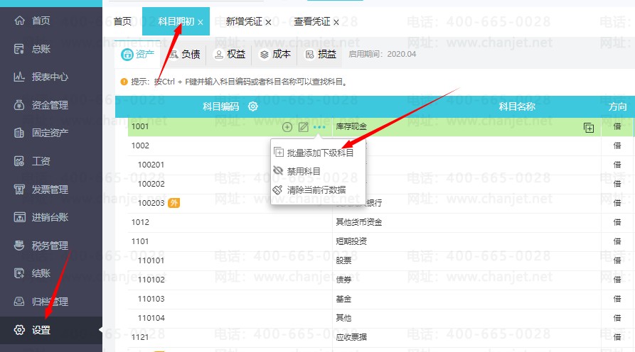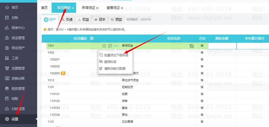 2.【点击设置】-【科目期初】-【…】下的【批量添加下级科目】