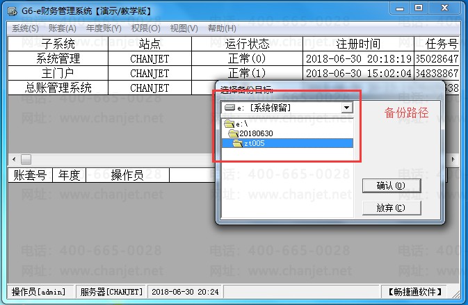 3.系统会自动开始备份,等待一会后会出现选择备份路径的对话框,比如备份到D:\20180630\zt005\下,点击“确定”,提示“硬盘备份完毕”,账套就备份好了(可以去查看一下D:\20180630\zt005\是否存在ufdata.ba_和UfErpAct.Lst文件);