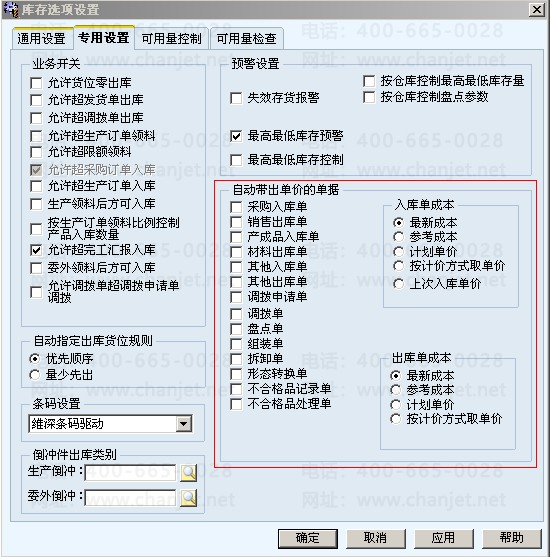 库存管理模块选项“专用设置”页签下设置自动带出单价