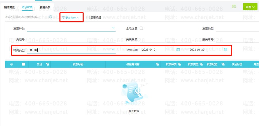 发票已经导入成功,因为导入的所属账期非发票日期所以看不到发票,进入进项发票中点击【更多条件】,筛选开票日期去查询发票。
