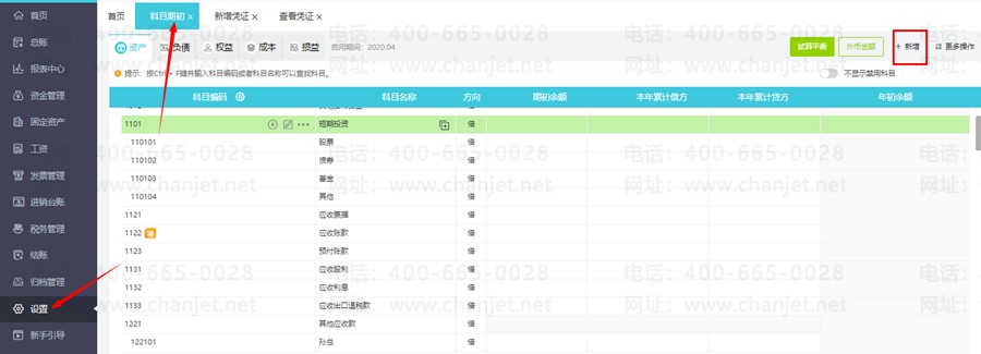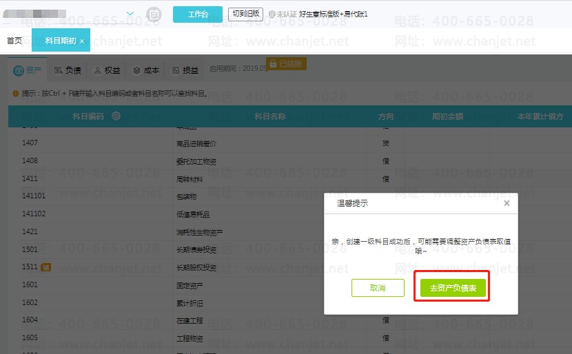 客户新增一个一级科目1406半成品,需要在【设置】-【科目期初】,点击右上角新增,创建成功后,系统会根据新增科目的类别弹出提示,如下图所示“亲,创建一级科目成功后,可能需要调整资产负债表取值哦~”