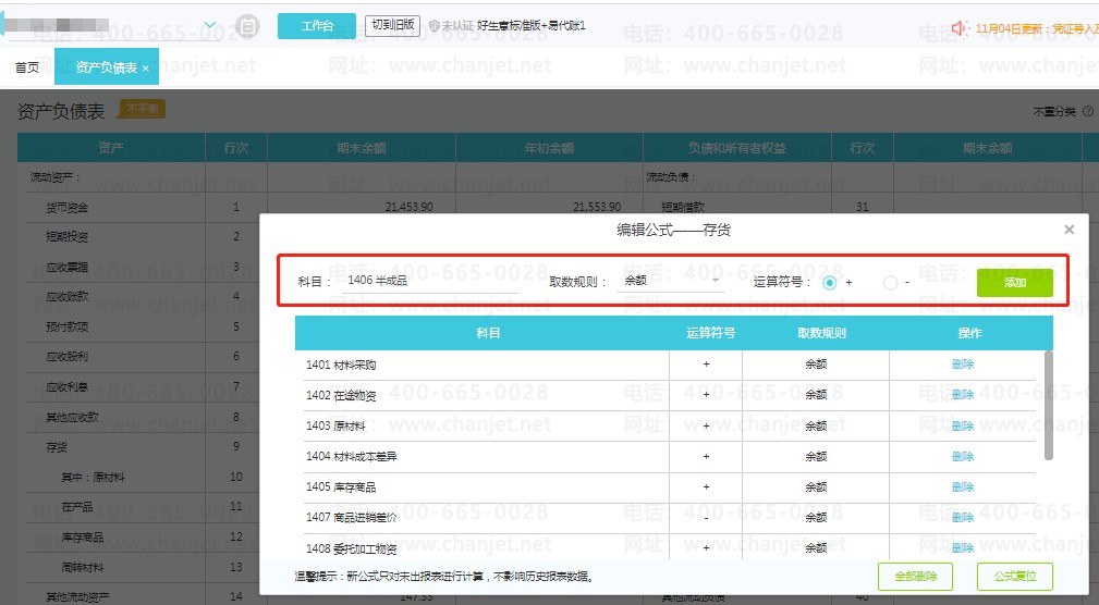 点开“存货”旁边的FX进行公式编辑,输入1406科目、取数规则选择【余额】,运算符号选择【+】,点击右侧的【添加】按钮,报表就按照新的取数规则来取数。