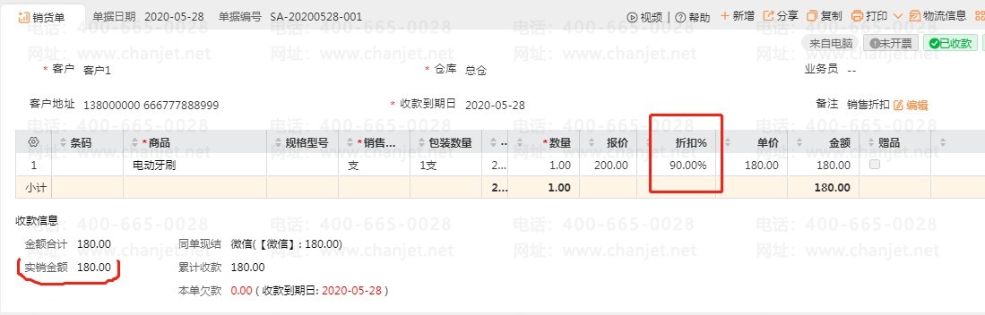 软件应用:在销货单【折扣%】中填写折扣 90%,此时本单的实销金额为 180 元,折扣的这部分金额在企业中需计入销售费用;