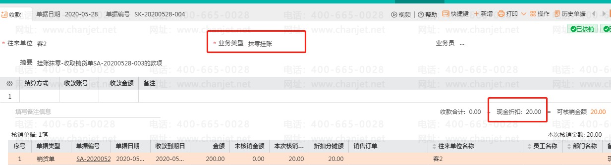 现金折扣这一部分金额会自动生成一张和销货单已核销,业务类型为【抹零挂账】的收款单。现金折扣的 20 元需计入企业的财务费用中;