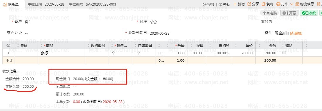 2.收款抹零/现金折扣:销售鼠标报价是 200,客户 2 购买了 1 个鼠标,收款时给客户少了20 元;