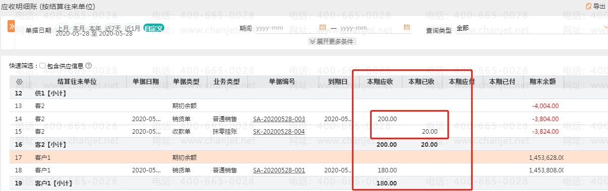 收款抹零/现金折扣:【本期应收】中这笔单据记录的应收为 200,同时对应这个客户的还有一笔【本期已收】的记录,现金折扣或抹零的金额记录在本期已收中。