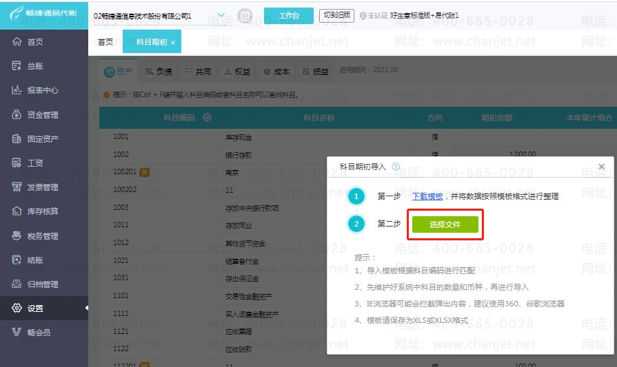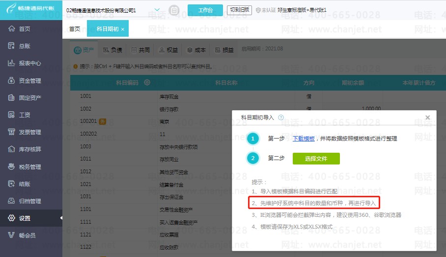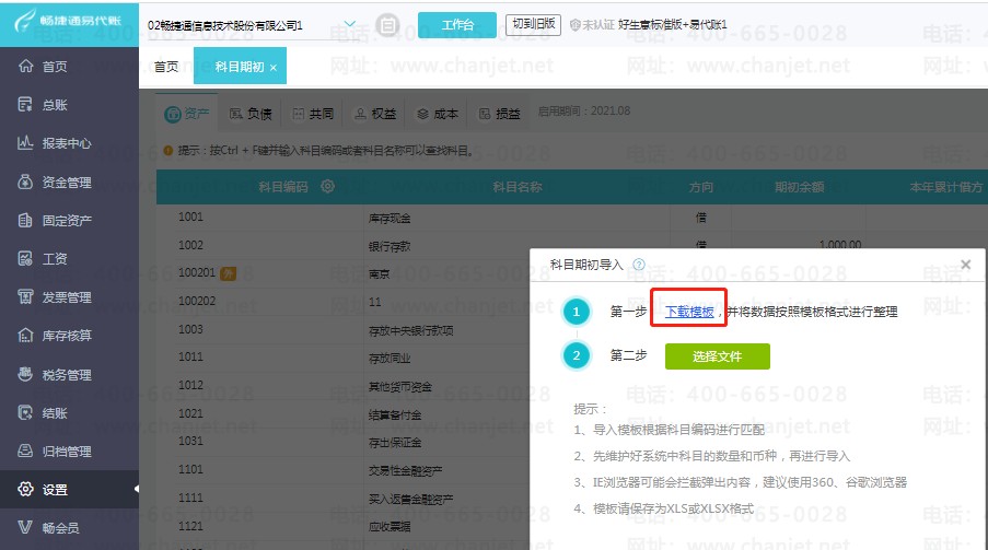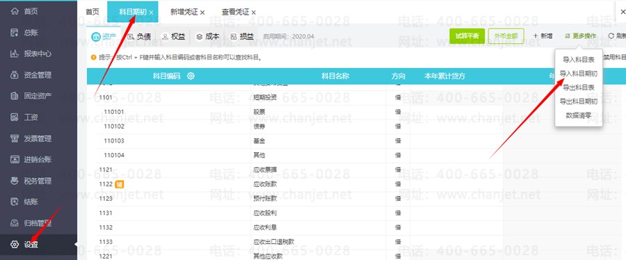 第一步:首先点击【设置】-【科目期初】,再点击右上角“导入”下的【科目期初】,下载导入模板;
