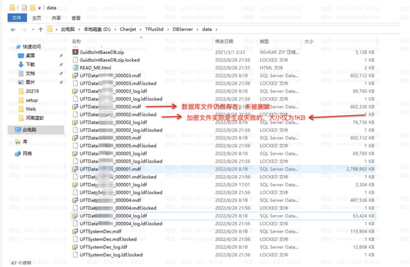 1、部分用户的数据库未被加密成功,可检查数据库目录(默认D:ChanjetTPlusStdDBServerdata)下的.mdf文件是否还存在,如还存在,则说明数据库文件未加密成功;如果都变成了.mdf.locked后缀的文件(后缀查看方法见下方PS附注),则说明被加密成功,无法恢复。