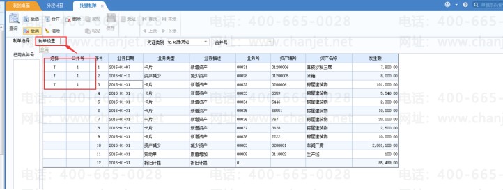 2.1选择多个业务类型并打上“Y”的标志,在合并号一栏维护相同的合并号(已使用的合并号不可再次使用)点击制单设置-凭证