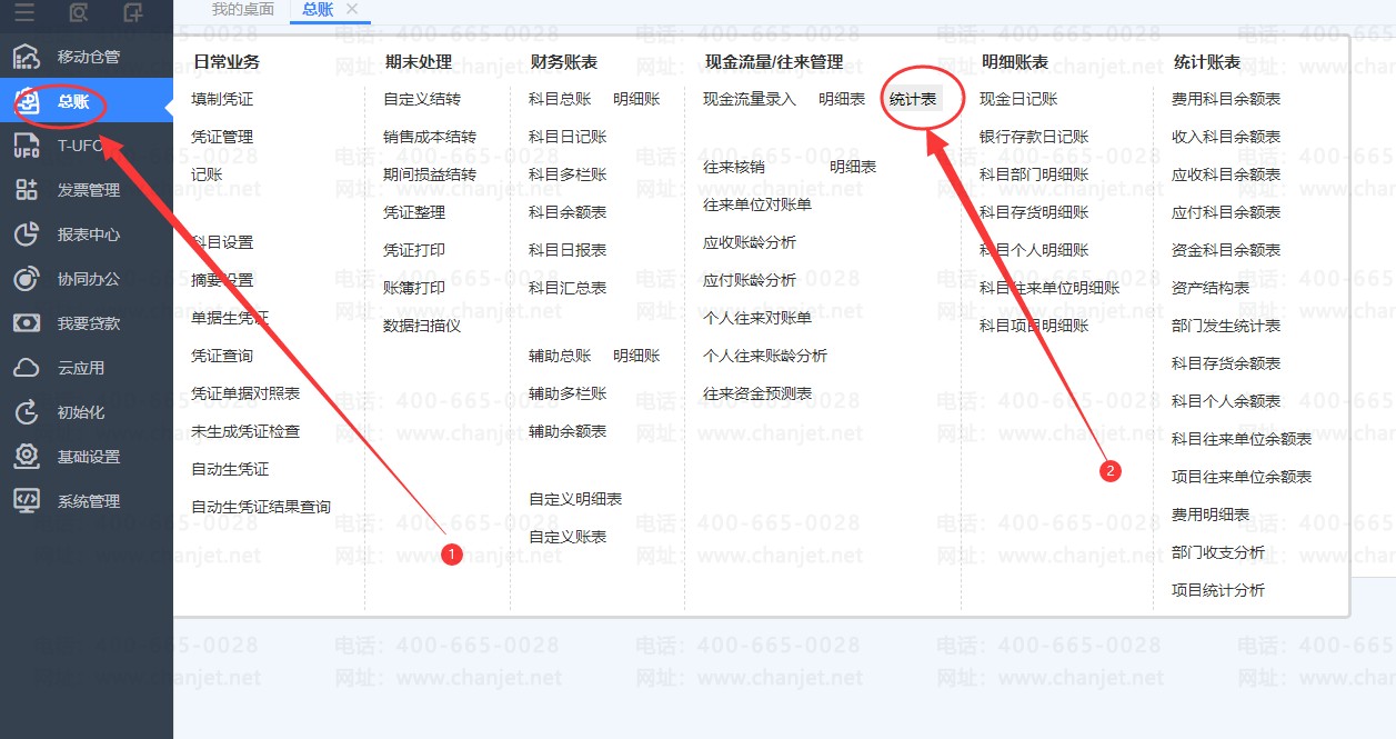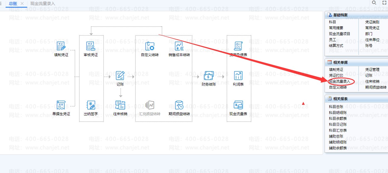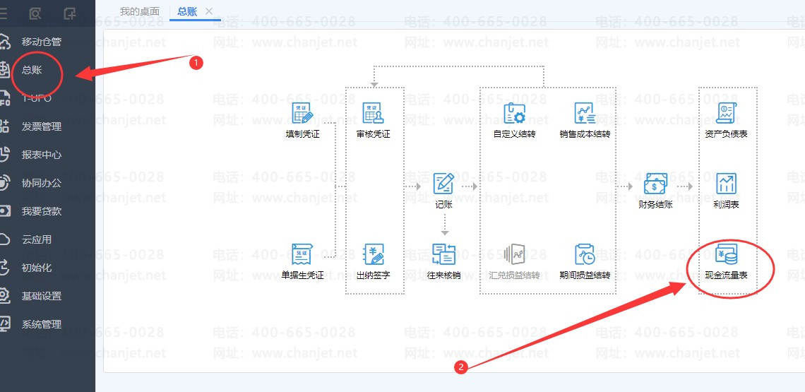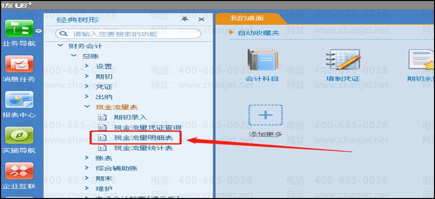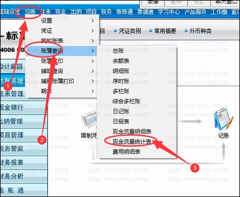 鼠标移到总账上面----------------然后找到现金流量表下面的统计表。