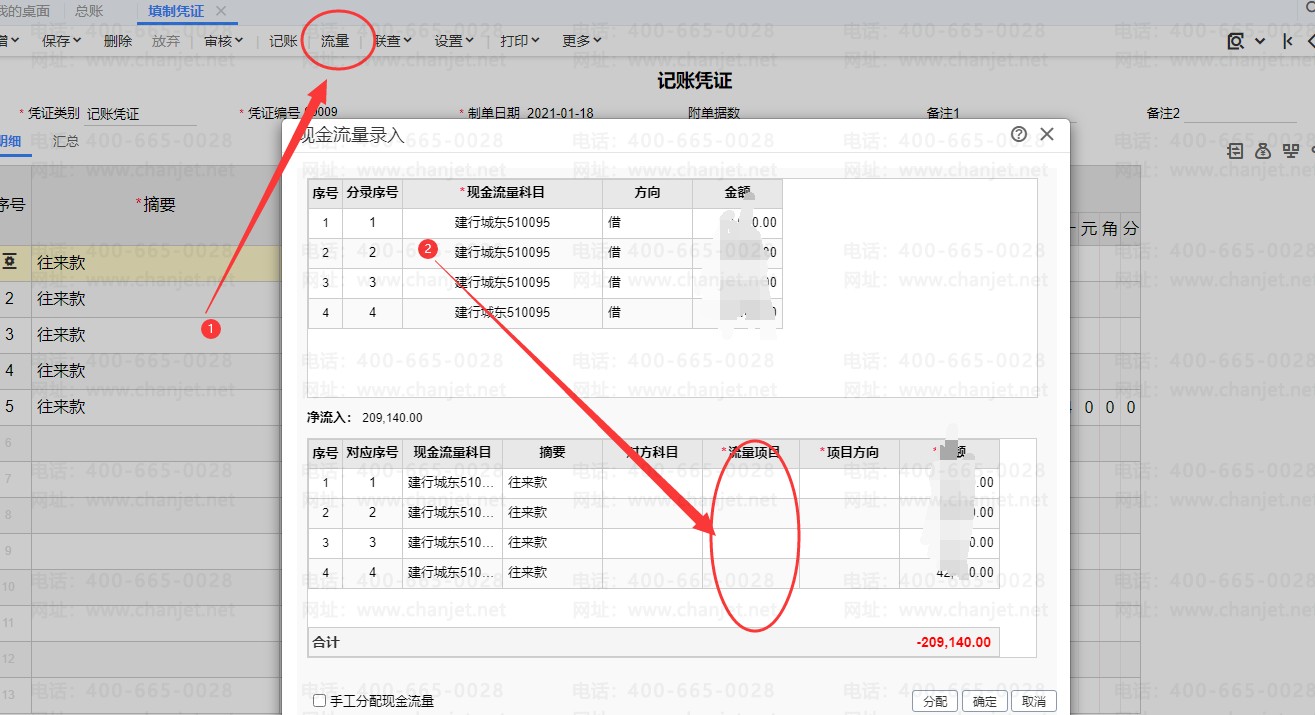 可以直接打开之前的填制凭证界面,找到有现金银行项目的科目,然后选中,点上面的“流量”,然后补录