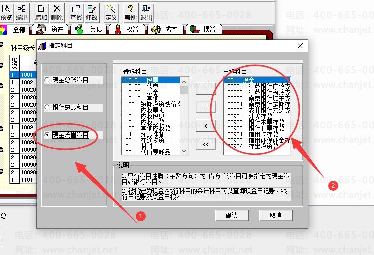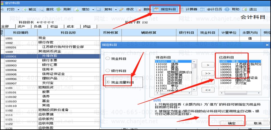 然后点“现金流量科目”,然后将所有现金流有关的科目选到右边。