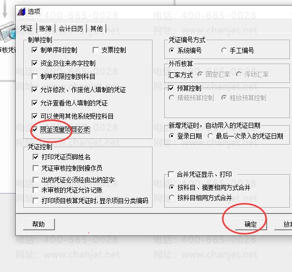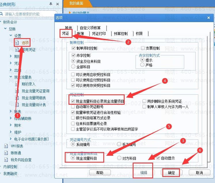 A、总账设置选项---凭证,看一下“现金流量科目必录现金项目”有没有勾选,下面的现金流量参照科目有没有问题。如果没有设置,需要先点一下3处的编辑,然后勾选完点确定。