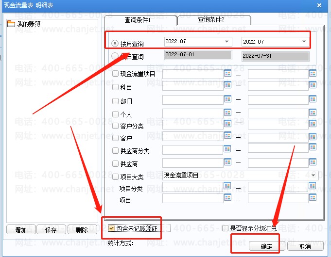 打开过滤条件, 可以查询单月的现金流量表,也可以查询一个季度的如:1月份-3月份,也可以查询半年的如:1-6月份,也可以查询中途季度的如:4-6月份,或者查询单月的都可以。查询出来的报表可以导出,也可以直接打印。