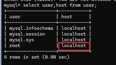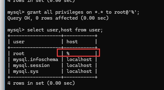mysql-u root -p;--添加权限 grant all on*.* to'root'@'localhost';--刷新权限 flush privileges;--切换mysql use mysql;--查看权限selectuser,hostfromuser;
