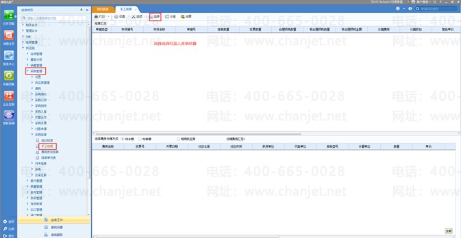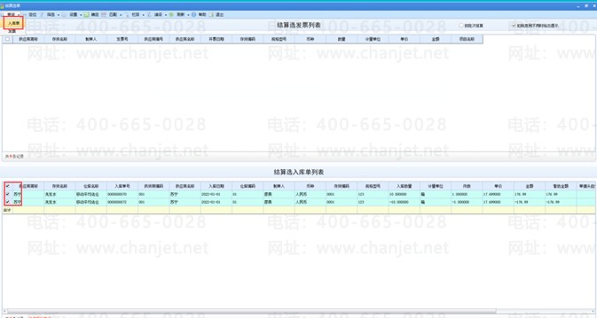 5、采购管理手工结算选择红蓝入库单(0000000070和0000000072)结算,注意红蓝入库单的数量相加等于0才可以结算;