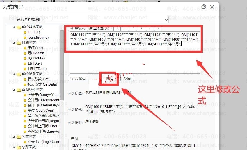这里的公式怎么修改呢?QM("4001","","年","月")这个QM是期末的意思,。后面的4001是对应的科目,。如果我们要在存货里面加其他科目的取数,直接在原有的公式后面+然后复制QM("4001","","年","月"),把4001改成对应的科目,确定即可