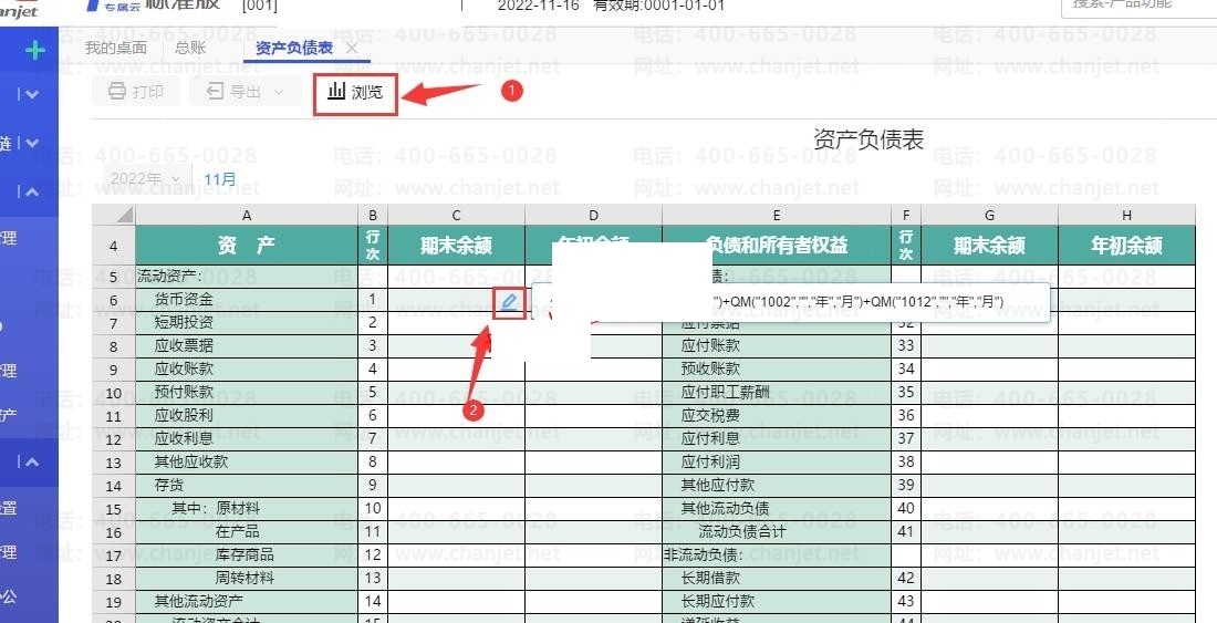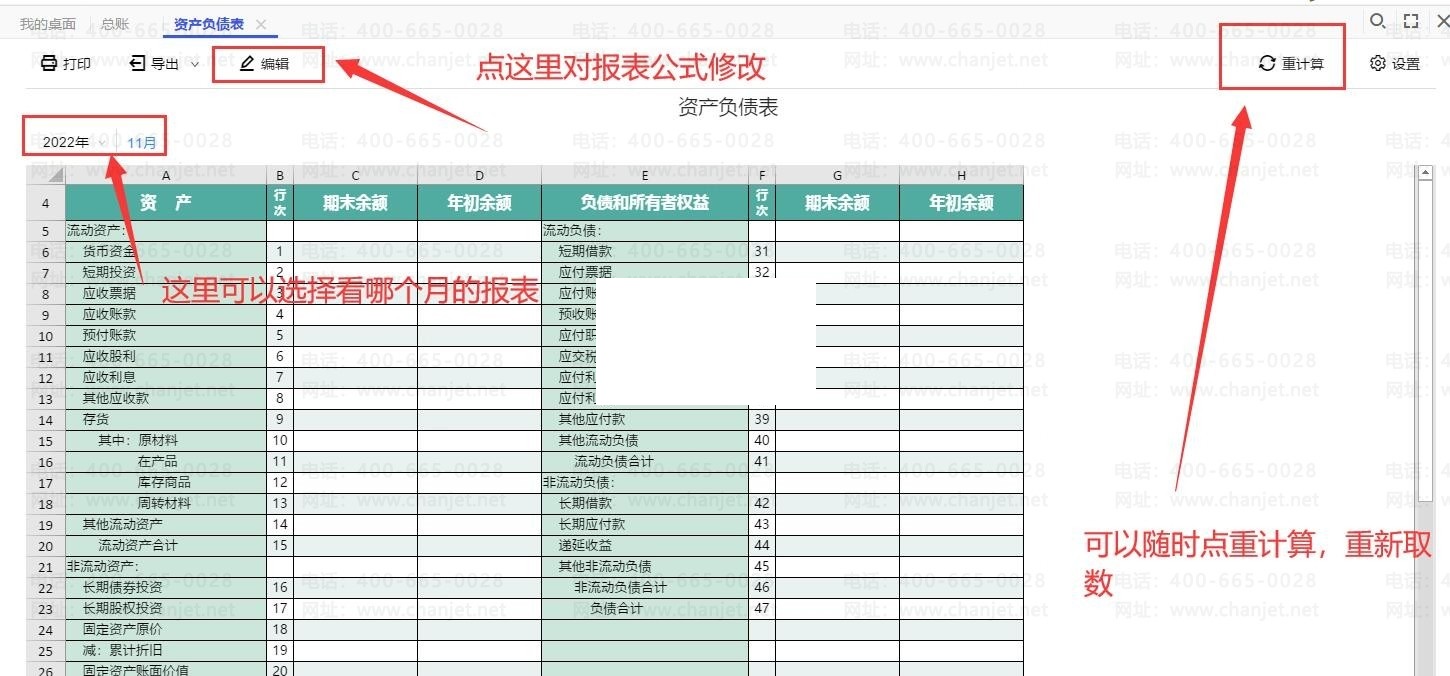 我们点开资产负债表,点上面的编辑,可以进行公式修改,左上角的日期选择取数计算的日期月份,右边重计算点一下,就会对当前报表重新计算。