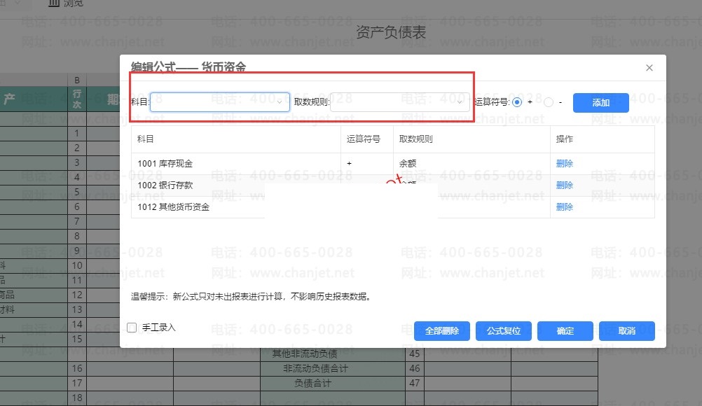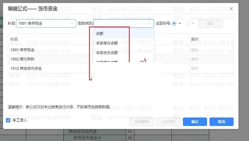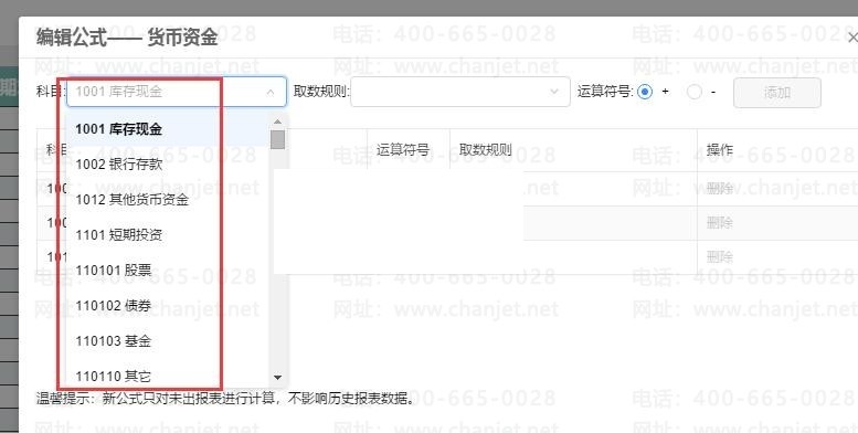 公式点开之后,可以看到下面是已有公式,可以删除重新添加,上面可以选新的添加,选择对应的科目,取数规则还有是增加还是减少,然后点添加,确定即可