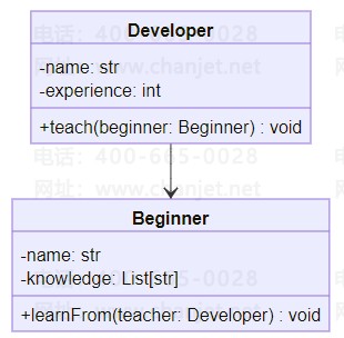 其中,Developer类表示经验丰富的开发者,Beginner类表示刚入行的小白。Developer类有一个teach()方法用来教导Beginner类,Beginner类有一个learnFrom()方法用来从Developer类中学习。