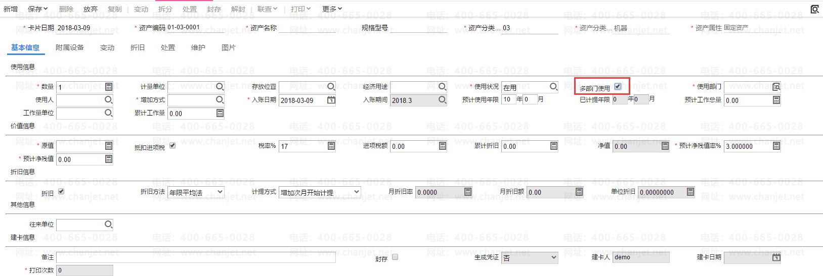 企业中经常会出现某一个固定资产由多个部门共同使用的情况,折旧费用也是多个部门按比例进行计提,在软件中如何处理?