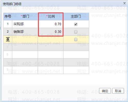 2、在“使用部门”-“部门明细”中选择相应的部门并输入对应的比例:
