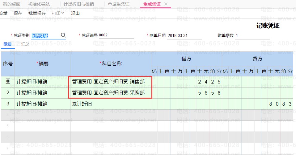 4、点击计提折旧与摊销后生成凭证,计算各部门相对应的累计折旧,分别为十分之七和十分之三: