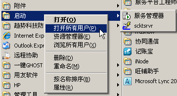 (1)通过右键点击“开始—程序/所有程序—启动”,选择打开所有用户,从软件安装路径下复制scktsrvr.exe,粘贴到启动界面中。