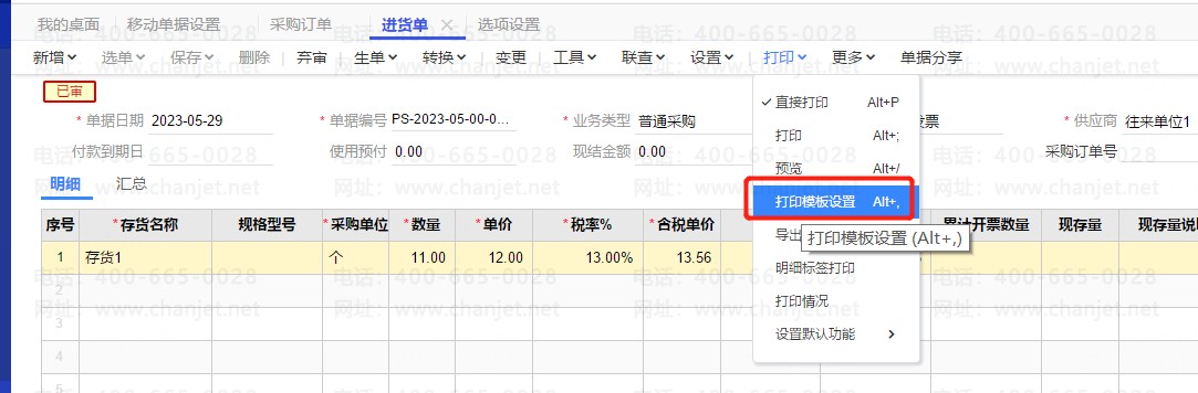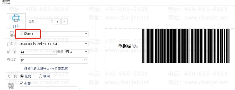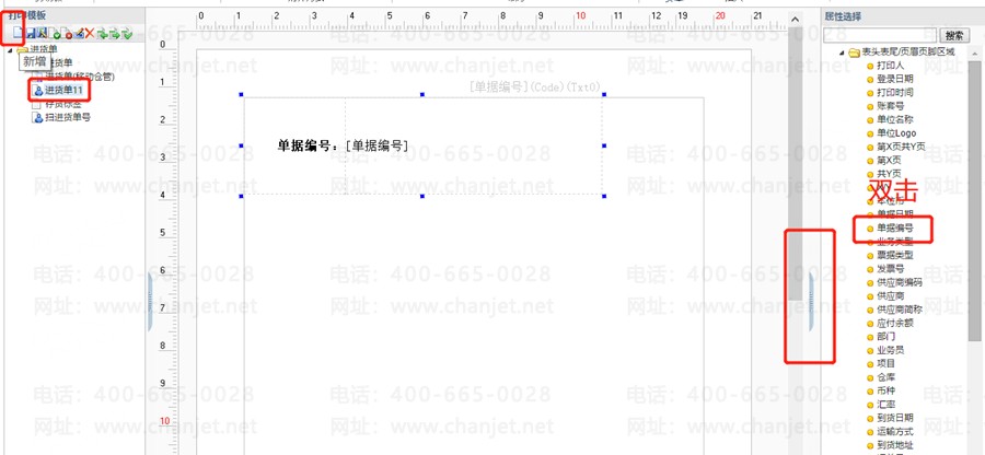 1. 增加好进货单后点击【打印】【打印模板设置】新增一个模板,然后点击右侧蓝条,双击单据编号,将编号增加至打印模板中。(也可以修改其他的模板)