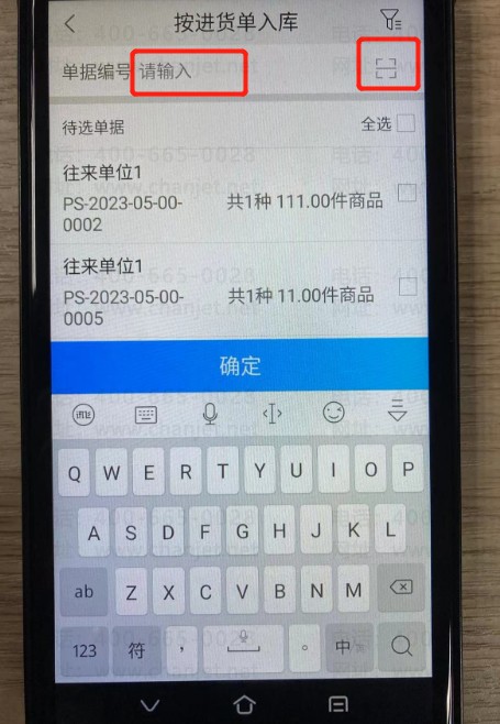 4. 移动仓管点击按进货单入库,点中单据编号后点击右侧扫码识别条码即可看到该进货单下的所有存货,此时可以手动拣货或者选择扫存货条码进行拣货