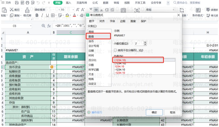 3、在excel表格中,右击此单元格,点击【设置单元格格式】,选择【数字】页签的【数值】,将【负数】格式改成红字括号格式即可