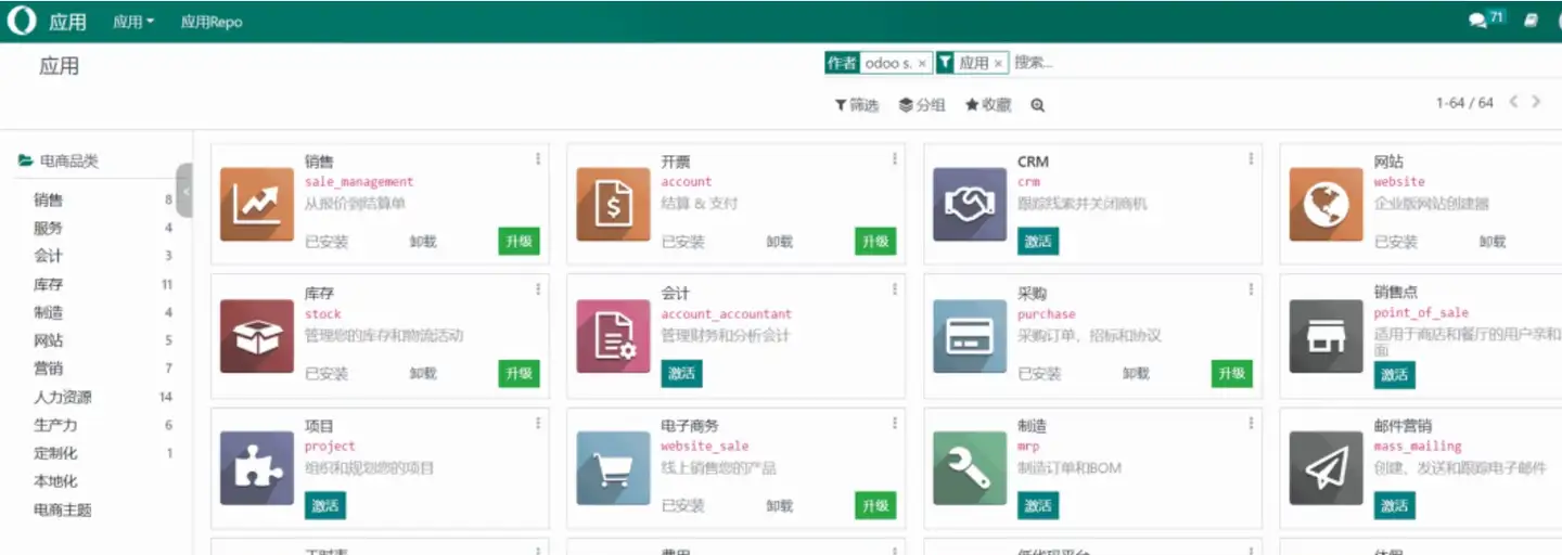 Odoo 是一个开源ERP系统,广泛应用于中小企业。它模块化设计,涵盖会计、库存、销售、采购和制造等功能。用户可以根据自身需求选择和定制模块,灵活性强,且成本较低,是中小企业的理想选择。