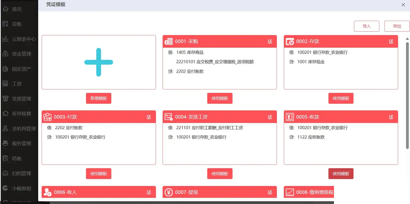 支持模板做账,直接调用之前的会计分录,修改下金额即可,每月常发生的业务,不用单独写会计分录的;