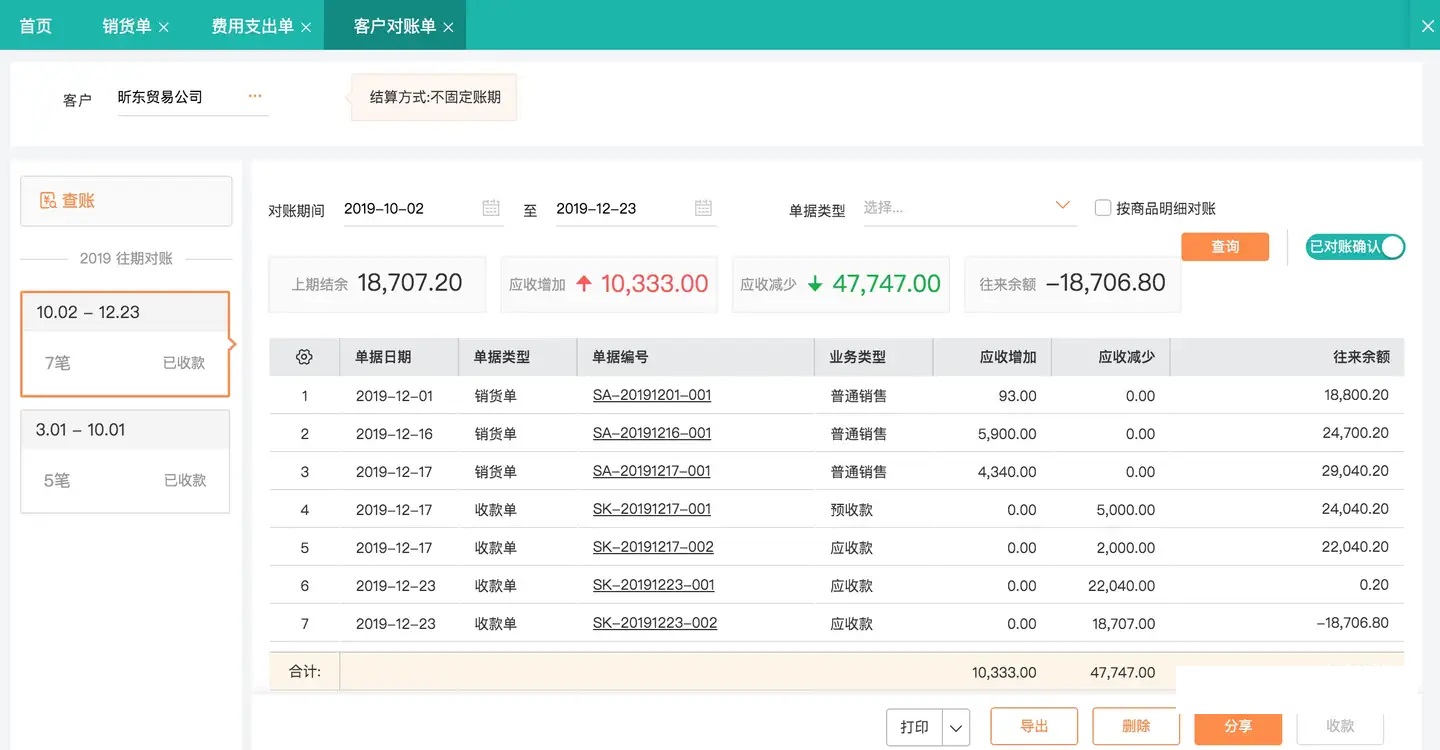 重点记录往来收付款,往来对账,日常收入费用记录及统计。比如客户对账单,客户核对过对账单后,商家进行对账确认,收款后,系统会自动更新对账单的收款状态。